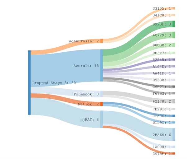 From these samples, the “Azorult” stealer accounts for 50% of the most delivered variant. Other payloads include “AgentTesla,” “Formbook,” “Matiex” and “njRat,” where “Azurult” and “njRAT” have a noticeable reuse rate.
