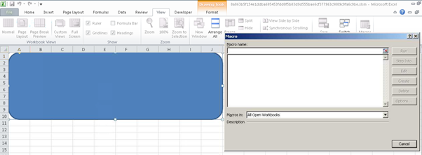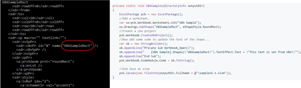 The document from Figure 4 contains a drawing1.xml object (a rounded rectangle) with this name: name=”VBASampleRect,” and created with the source code found on the EPPLUS Wiki (on the right side) as observed below.