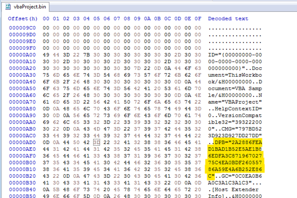 Nonetheless, the malicious code exists and is protected with a password. It is interesting to observe that the VBA code is not encoded; it is stored in clear text.