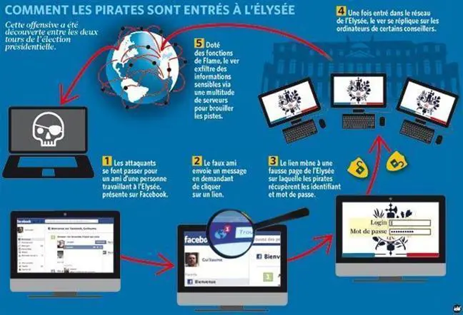 The attack against the president's office was of the spear phishing type that used popular social network Facebook to spread the malware. The attackers shared a link to an infected website that was a replica of the Elysee's intranet and used it to infect the machines and also to gather users' credentials. All the machines in part of the presidential network, including a number of Sarkozy's closest collaborators, were infected by the Flame agent.
