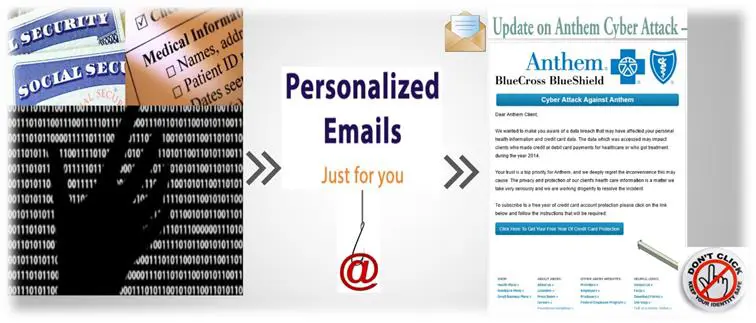 What happened next is that the customers of Anthem, presumably those whose data was stolen, started to receive bogus emails encouraging them to click on a link for credit monitoring services. Obviously, stealing data can make a phishing campaign all the more effective. Not only did the Anthem leak allow criminals to target victims by employer or income, but they could draft in no time elaborate, personalized missives.