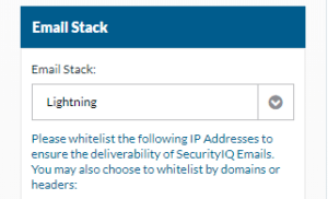 This section of account settings will go over the email stack that is currently being used to send PhishSim/AwareEd emails. Here you will be able to find a list of all: IP addresses, domains and email headers to whitelist within all of your firewalls, security appliances, and any spam filters. Please note that if you select a different option from the drop down and save, that SecurityIQ will then use the displayed IP addresses, domains and email headers for all future emails. If proper whitelisting has not been accomplished, it is possible that the delivery of emails may not be successful.