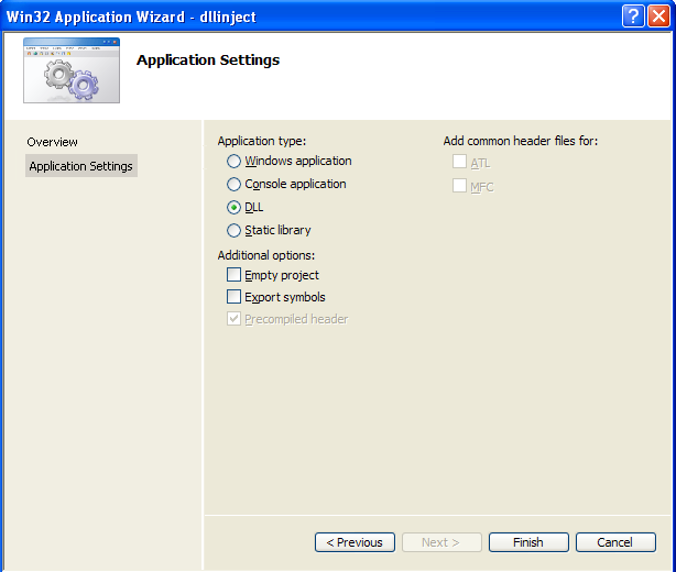 We named the project dllinject, which will also be the name of the created DLL once we compile the source code. When we click on the OK button, a new window will appear where we must select that we're building a DLL not a console application (which is the default). This can be seen on the picture below (notice that the DLL is checked):