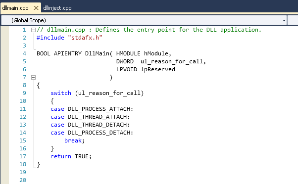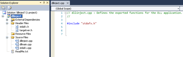 When we click on the Finish button, the project will be created. There will be two header files named stdafx.h and targetver.h and three source files named dllinject.cpp, dllmain.cpp, and stdafx.cpp. The initial project will look like the picture below: