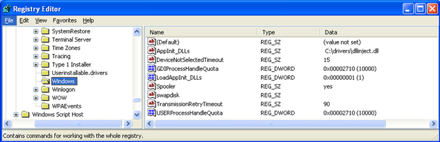 The next picture shows how we have to specify the AppInit_DLLs in order to inject the C:driversdllinject.dll module into every process that uses user32.dll library: