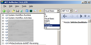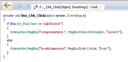 Let us now see why this piece of compiled code shows us "Invalid password". Open up Reflector, at this point we can configure Reflector via the language's drop down box in the main toolbar, and select whatever language you may be familiar with. I'll choose Visual Basic, but the decision is up to you of course.