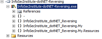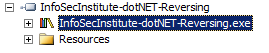 - Code: this part contains the interesting things, and everything we will need at this point is inside of InfoSecInstitute_dotNET_Reversing (which is a Namespace).
