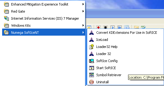 To start SoftICE debugger we need to click on the "Start SoftICE" option that's accessible under the All Programs options, as can seen on the picture below: