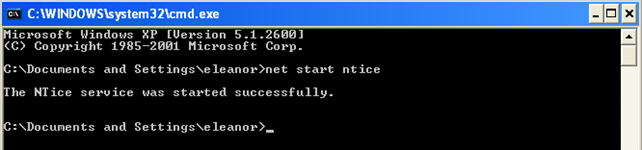 When clicking on "Start SoftICE", the "net start ntice" command is being run, so the SoftICE debugger was installed as a service that we must start whenever we want to start the SoftICE debugger. Since we're only starting the service, let's do it from the command prompt. Below we can see that the NTice service was started successfully: