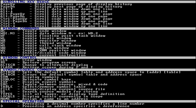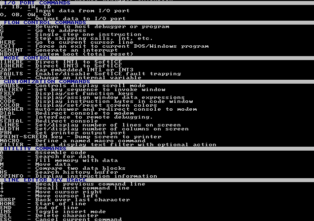 If we enter the :help command into SoftICE, we should receive all the commands SoftICE supports. All the commands are presented on the four pictures below. This is being done because it's rather hard to get all the commands out of the SoftICE quickly. Now you can just open up the tutorial and check out the command you're interested in.