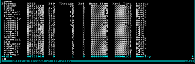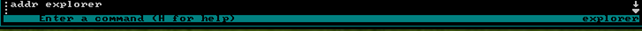 What's interesting is that when entering the :proc command all the processes are displayed, but with quite a lot of information. Each line displays the process name, process ID (PID), process threads, status, etc… Let's start by entering the address space of the explorer process by executing the "addr explorer" command, as seen on the picture below:
