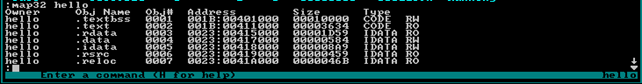 Notice that on the right side of the status line we can see the text explorer, which means that we're currently debugging the explorer process. If we would like to display all the sections of the explorer process, we can do that with the maps32 command, as seen on the picture below: