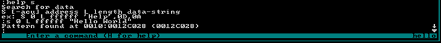 Let's now search for the string "Hello World" in the executable. On the picture below, we can see that we first printed the help of the search command and later inputted the search command that searches for the "Hello World" string, which is found at address 0x0012C028.
