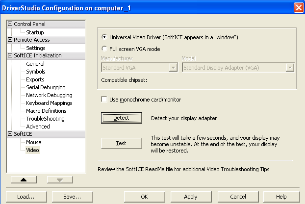 After downloading the full SoftICE package, the archive has enclosed instructions on how to install SoftICE. Basically, we have to do the same things as above, but once it's installed, the configuration window has a little more options, as we can see below: