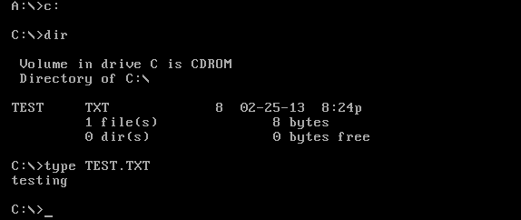 When starting MSDOS, the contents of the ISO should now be accessible via one of the drives C:, D:, or some other letter. In our case, this was the C: drive. On the picture below we first used the "c:" command to change our current directory to C: drive and then printed the contents of the C: drive with the dir command.