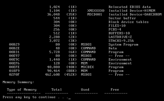 Upon booting up MSDOS, we can observe the memory using the "mem /d /p" command, which will show us exactly which part of memory is used by the system, processes, or for IVT, etc. For this article, we're particularly interested with the IVT table that contains the interrupt vectors. It is 1024 bytes in size, so it can hold 256 interrupt vectors.