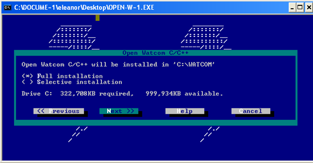 After clicking Next, you have to specify whether you would like a full or selective Watcom installation. This step can be seen below: