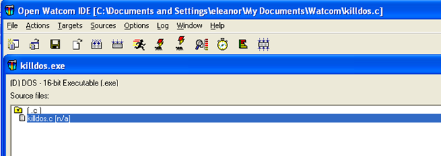 So, Watcom is now up and running. To create a new product, select File – New Project, and specify the name of the project and the Target Environment. This can be seen on the picture below, where we've typed killd as project name and selected the DOS – 16-bit target environment, which will compile the source code to a 16-bit executable that can be run in MSDOS.