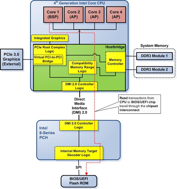 Figure 1 shows the CPU core fetching code from the BIOS/UEFI flash ROM connected to the PCH ("southbridge") via the serial peripheral interface (SPI)—see the dashed red line in Figure 1. This is what happened in the very early boot stage, when the CPU has just finished initializing itself and starts to fetch code located in the reset vector. The presence of "compatibility" logic in the platform, as shown in Figure 1, makes it possible to run DOS or 32-bit OS without any problems.