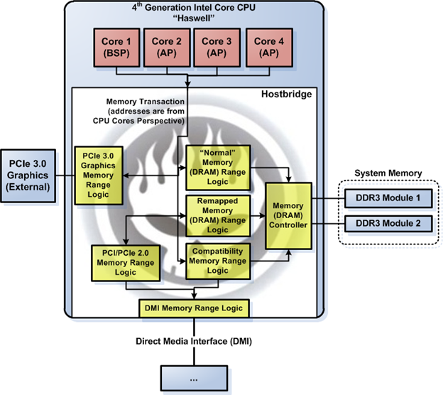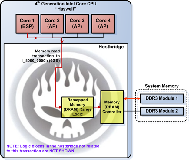 The sample memory read transaction illustrates how the logic block in the hostbridge claims a memory read transaction and processes it accordingly. The Haswell system address map should be clear to you once you fully understand this memory read transaction sample.
