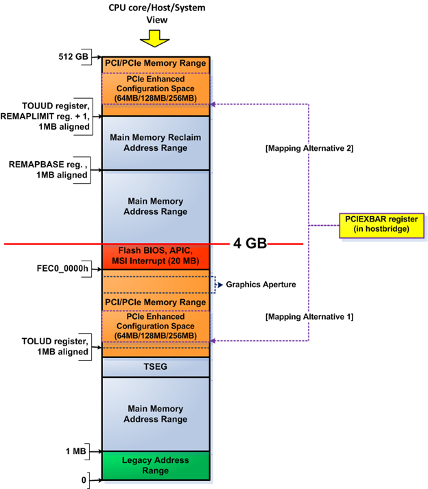 On the Haswell platform, the PCI express register range base address (PCIEXBAR)—a register—in the hostbridge determines the location of the PCIe enhanced configuration space. PCIEXBAR contents determine the start address and the size of the PCIe enhanced configuration space. Figure 16 shows the two possible alternatives to map the PCIe enhanced configuration space. They are marked as "Mapping Alternative 1" (within the PCI/PCIe memory range below 4GB) and "Mapping Alternative 2" (within the PCI/PCIe memory range above TOUUD). PCIEXBAR can set the size of the PCIe enhanced configuration space to 64 MB, 128 MB or 256 MB. The platform firmware should initialize the bits that control the size of the PCIe enhanced configuration space in PCIEXBAR at boot.