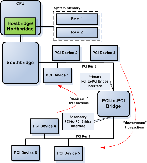 Figure 3 shows an illustration of PCI-to-PCI bridge primary and secondary interface in a hypothetical platform—the platform components' inner workings are the same with a real world system despite the platform is hypothetical; it's just simplified to make it easier to understand. PCI bus 1 connects to the PCI-to-PCI bridge primary interface and PCI bus 2 connects to the PCI-to-PCI bridge secondary interface in Figure 3.