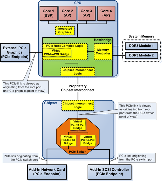 Figure 4 shows the physical location of the root ports of the PCIe root complex. One is directly connected to the PCIe root complex and the other is not directly connected to the PCIe root complex—i.e.. connected via the chipset interconnect. In the latter case, the chipset interconnect is said to be transparent with respect to PCIe device tree topology. Figure 4 shows the external PCIe graphics links to the root port that's located in the PCIe root complex while the PCIe switch links to the root port via the chipset interconnect. There is no difference between them from a PCIe logic point of view.