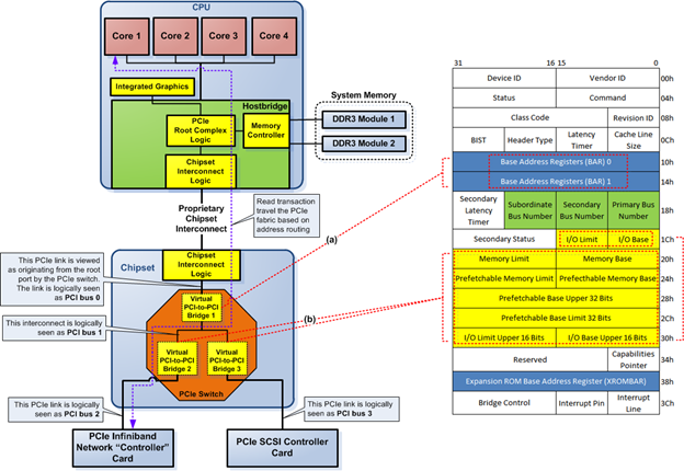 PCIe hardware is logically represented as one PCI device or a collection of PCI devices. Some contain logical PCI-to-PCI bridge(s). The first part of this series doesn't delve much into PCI-to-PCI bridge. Therefore, we're going to take a much closer look into it here because it's used heavily as a logical PCIe device building block. For example, the root port ("outgoing" port from the root complex) is logically a PCI-to-PCI bridge and a PCIe switch logically looks like several connected PCI-to-PCI bridges.