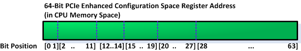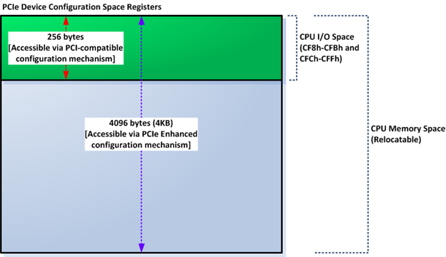 - PCIe configuration space—This address space is used to access the PCI-compatible configuration registers in PCIe devices and also the PCIe enhanced configuration registers. Part of this address space that resides in the CPU IO space is provided for backward compatibility reasons—i.e., compatibility with PCI bus protocol. The rest of the PCIe configuration space resides in the CPU memory space. The access mechanism for the first 256 registers is the same as in PCI for x64 architecture, i.e., using IO port 0xCF8-0xCFB for address and 0xCFC-0xCFF for data. As in PCI devices, there are 256 eight-bit configuration space registers that are mapped to this IO address space in PCIe. The first 256 byte configuration registers are immediately available at the very early boot stage via the CPU IO space (because the mapping doesn't require firmware initialization), while the rest are available only after the platform firmware finishes initializing CPU memory space used for PCIe configuration space. PCIe supports a larger number of configuration space registers than PCI. Each PCIe device has 4KB configuration space registers. The first 256 bytes of those registers are mapped to both the "legacy" PCI configuration space and to PCIe configuration space in the CPU memory space. The entire 4KB PCIe configuration space registers can be accessed via PCIe enhanced configuration mechanism. PCIe enhanced configuration mechanism uses the CPU memory space instead of the CPU IO space (PCI configuration mechanism uses the CPU IO space in x86/x64 architecture).