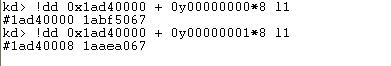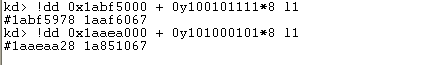 I've separated the linear addresses into the four parts separated by character '|'. The first part is 0x00 in both cases, which means that the first entry from the PDPT table is used to resolve both of the linear addresses into physical addresses. The first entry in the PDPT table is: 0x1ad40001. The first 12 bits in the address must be discarded, because those bits are used for offset only, so the 001 bits become 000 and the base physical address of the second table is thus 0x1ad40000 (this is the base address into the PDT table). Now that we have the base address of the PDT table, we must again use the .formats command to display it in different representations (the binary form). The PDE entry must be split in a couple of elements, but for now we're only interested in the base physical address of the page table, which is contained in the 12-31-bits (again the binary representation is splitted with the '|' character). We also need to present the right PDE entries, based on the index into the PDT table. Since both linear addresses use the first PDPTE entry 0x1ad40000, a binary representation of that address is in order: