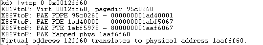 Above, we've walked all the tables that are used to translate the virtual memory into physical memory manually. At the end we've been able to get the actual physical addresses to the corresponding virtual addresses, but we had to do a lot of work to translate one single address. Isn't there a better way of doing this? Of course there is!Windbg provides two commands that can help us with that:the !pte and !vtop commands. To display the whole translation routine, we can execute the "!vtop 0 0x0012ff60" command, where the first argument 0 specifies that we would like to use the currently debugged process's context. The first parameter to !vtop command is the page frame number, which is the same number as DirBase without the trailing three bytes. The second parameter specifies the virtual address to translate into physical address. Before being able to use the !vtop command, we must use the "!process 0 0" command to display the environmental variables – particularly DirBase– of the current process, and then use .process command to set the current index into the process's context switch structure in memory. After that we can use the !vtop command successfully, as can be seen below: