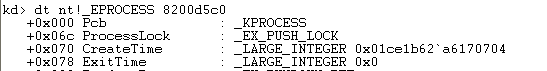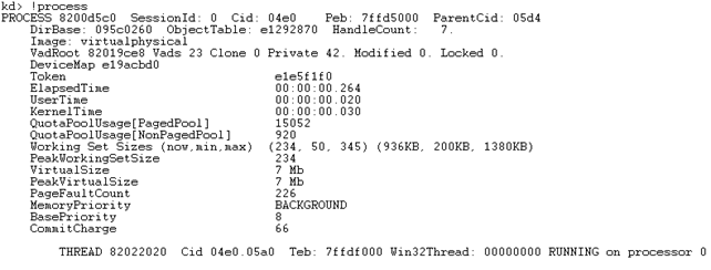 Notice that the DirBase specifies the 0x095c0260 physical address? This confirms that we're talking about the right address. The same information can also be obtained from the EPROCESS structure. To display the EPROCESS structure of a particular process, we can use the "dtnt!_EPROCESS addr" command as seen below. The 0x8200d5c0 is the address of the process structure in memory, which was obtained by the previous !process command.