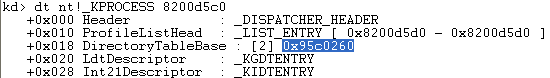 We're looking for the DirectoryTableBase element, which is further contained in the Pcb KPROCESS element. To dump that element, we can use the "dtn!_KPROCESS<addr>" command. This can be seen below, where the 0x018 is the entry we're looking for and again the address 0x95c0260 is displayed.
