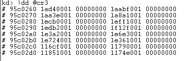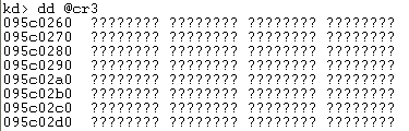 What's happening? There should be a PDPT table with defined PDPTE entries or page directory table with defined PDE entries at that address!It's true, the PDPTE or PDE entries should be present, and indeed they are. We've just made a mistake that often pops-up. The address in the CR3 register is the physical address, while the dd command dumps the values from virtual addresses, so what we've actually done is dump memory at virtual address 0x94401a0. To dump physical memory from that address, we need to prepend the character '!' to the ddcommand . The actual command to dump from physical address thus becomes !dd and can be seen on the picture below: