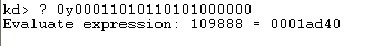 Since the lower 12-bits are discarded, the rest of the bits areas follows: 00011010 11010100 0000. We can transform the binary number back into the hexadecimal representation with the "? 0y00011010110101000000" command: