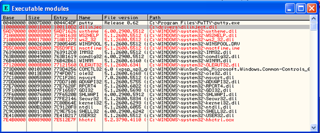 Here we'll see whether our injection program works. First, start OllyDbg and load putty.exe program. Upon starting, the putty.exe will load the modules presented on the picture below: