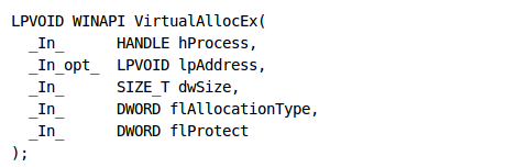 The next function is VirtualAllocEx, into which we need to take a closer look. Let's present the syntax of the function, which can be seen below [3]: