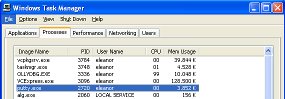 The PID of the putty.exe is 2720. This is also the PID we must put into the code of our previously presented program. We must change the code to look like this: