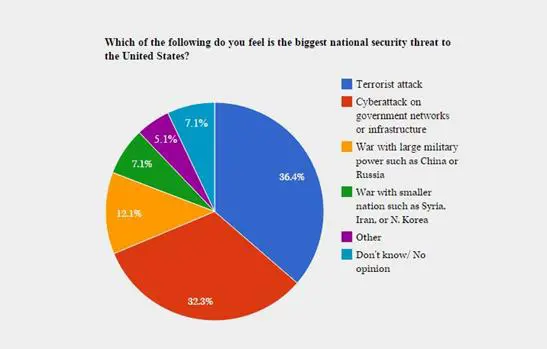 Nearly 36 percent of voters consider acts of terrorism at the top of a list of major security threats, followed by cyber-attacks at 32 percent.