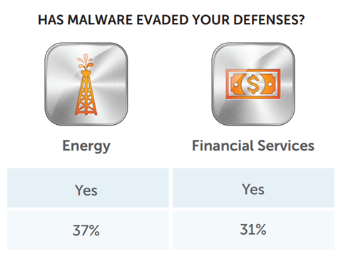 "The survey found that 35% of respondents reported endpoints on their network had been infected by malware that evaded their defenses during the last 12 months. Moreover, 58% of respondents cited the complexity of malware as the most difficult aspect of defending their organization," reports the survey, highlighting the difficulties of tracking the threats due to their level of sophistication. "Respondents within the energy sector (37%) reported a 6% higher rate of infection than their financial services counterparts."