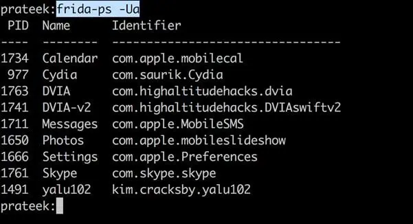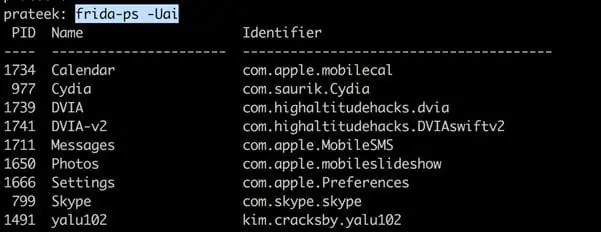 From your computer, simply issue the command frida-ps -U. Make sure the jailbroken device is connected to your computer over USB. If you get similar output, it means Frida is all set up and running.