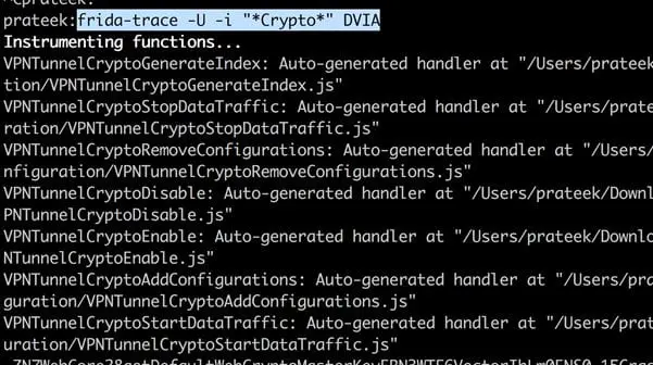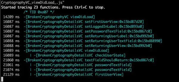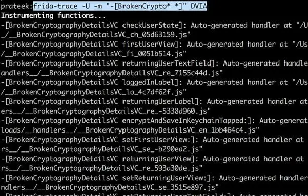 In case of DVIA (Objective-C version), you can go to the Broken Cryptography section and start the challenge. To trace a particular Objective C method, you can specify it with the -m option. If the method calls match the provided regex, you will see the output as shown in the image below.