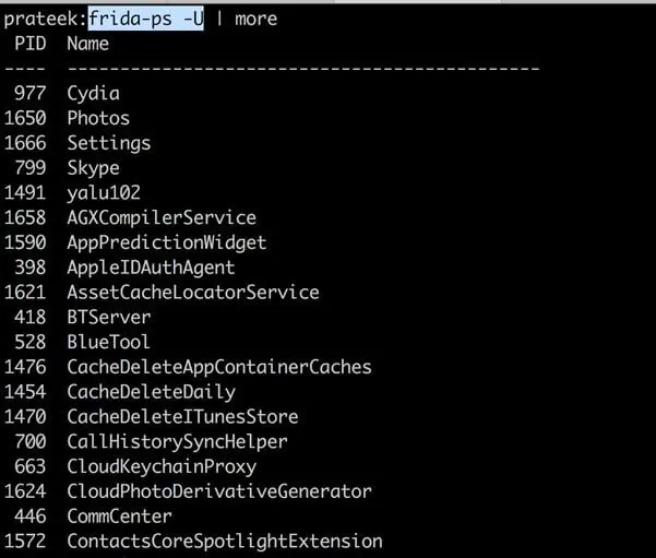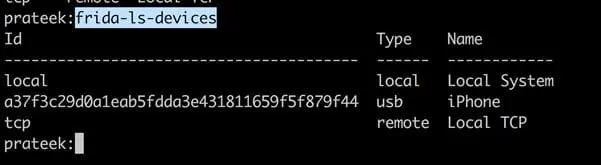 Issuing the command frida-ps will just show you a list of the processes running on your computer. But right now, we are interested in iDevices. Running the command frida-ls-devices will show all the devices connected to the computer. We can interface with this device with frida-ps -U command. If there is more than one device, you will need to specify the UDID.