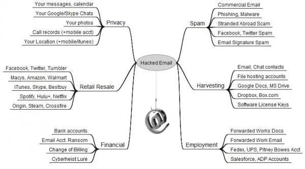 Email accounts are the containers where crooks can access an infinite amount of information, including passwords, documents, credit card data, utility bills and much more. A fraudster taking over a victim's account could discover his network of contacts, examine his habits, find information about his expenses (e.g. Travel, books, etc.), and then use the hacked email account to gain the access to the accounts of other web services (i.e. Facebook, eBay, PayPal, other email accounts).