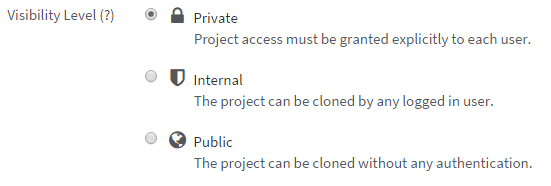 Figure 1: Project repository-global access rights (Visibility Level) configuration when creating a new project in GitLab. Don't forget to define proper access rights per user.