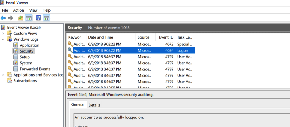 Here is where you will be able to see all the login activity. The event IDs that you will want to search for are Logon Success (4624), Logon Failure (4625) and Account Lockout (4740).