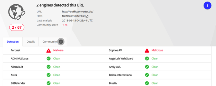 The suspected URL that I searched for is trafficconverter.biz:80/. The result returned from Virus Total is below:
