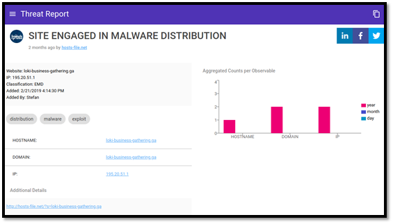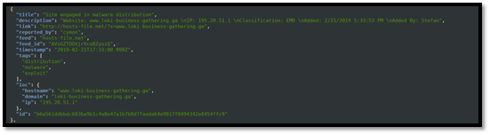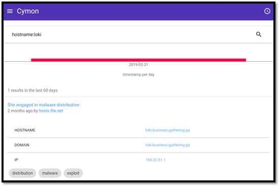 Our malware research team discovered that the malware made attempts to download variants of the malware from the IP address 195.20.51.1. We resolved the IP address to the domain loki-business-gathering.ga and discovered from Cymon that this domain was actively involved in malware distribution. The command below was used to interact with Cymon for more information.