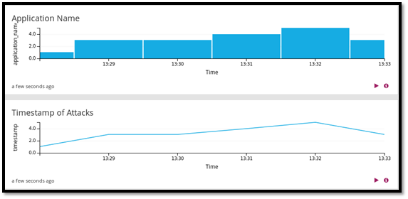 We decided to add graphs of the timestamps of attacks and application name to the dashboard. This is shown below.