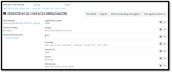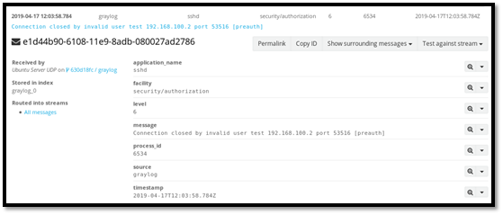 Graylog allowed us to access granular information for each alert logged. For instance, drilling down to one failed SSH log is shown below: